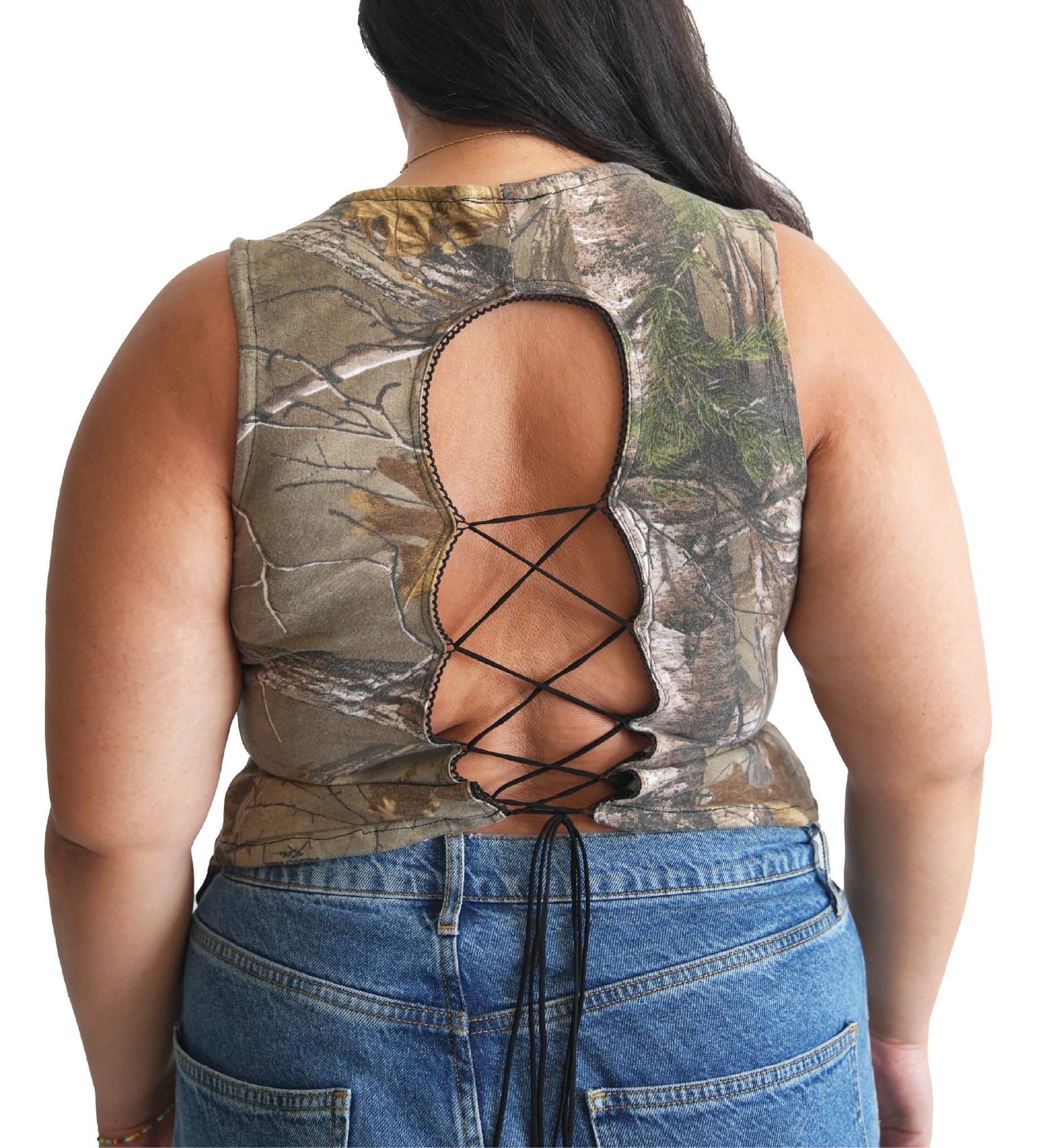 This 1 of 1 corset top features a hook & eye closure at the front and adjustable lace up detail at the back.