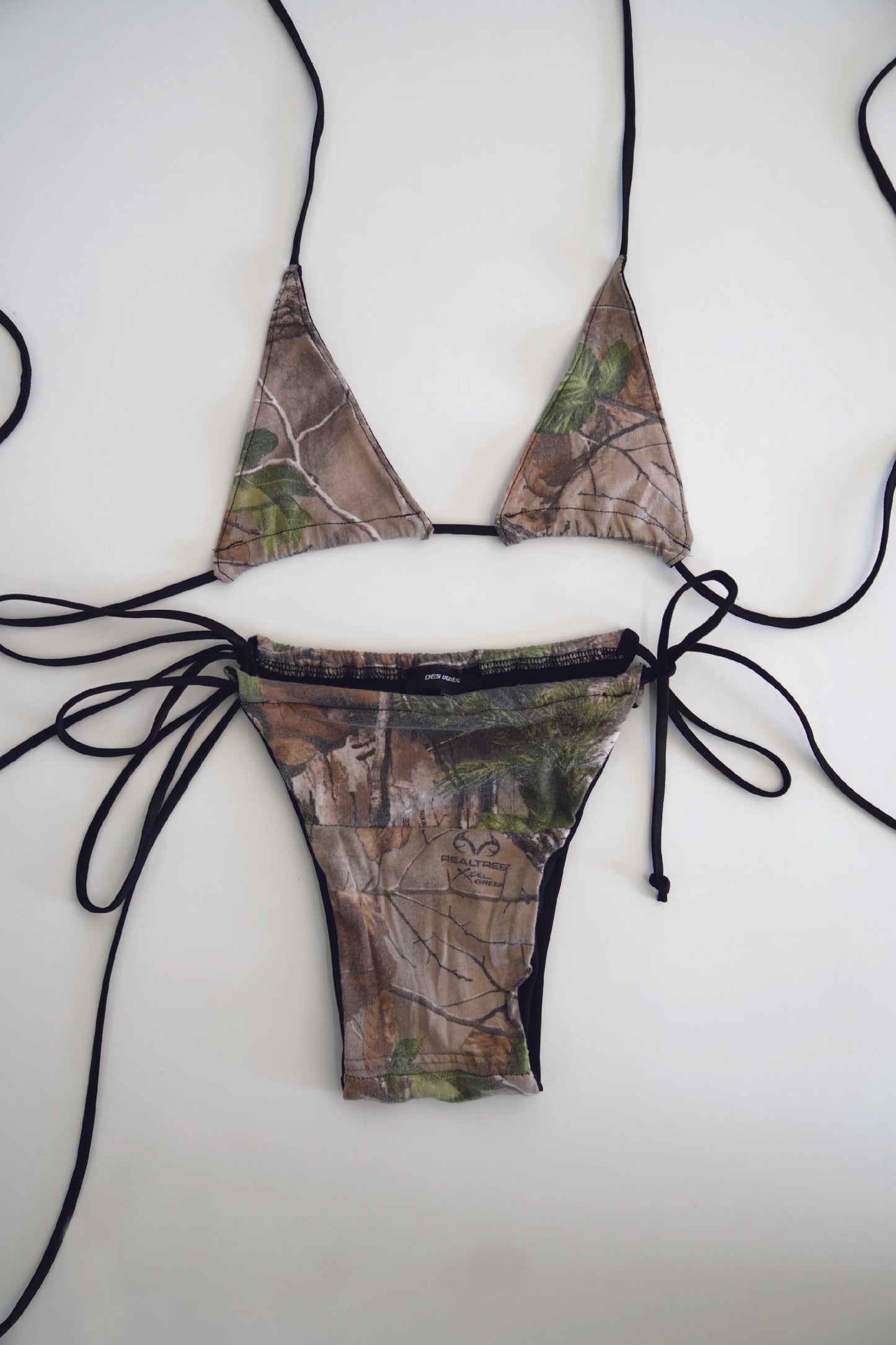 This 1 of 1 kini set is a classic triangle bikini shape with ultra-thin straps that tie around the neck and back to give you a comfortable, custom fit. Kini bottoms are super cheeky with adjustable ties at the sides.