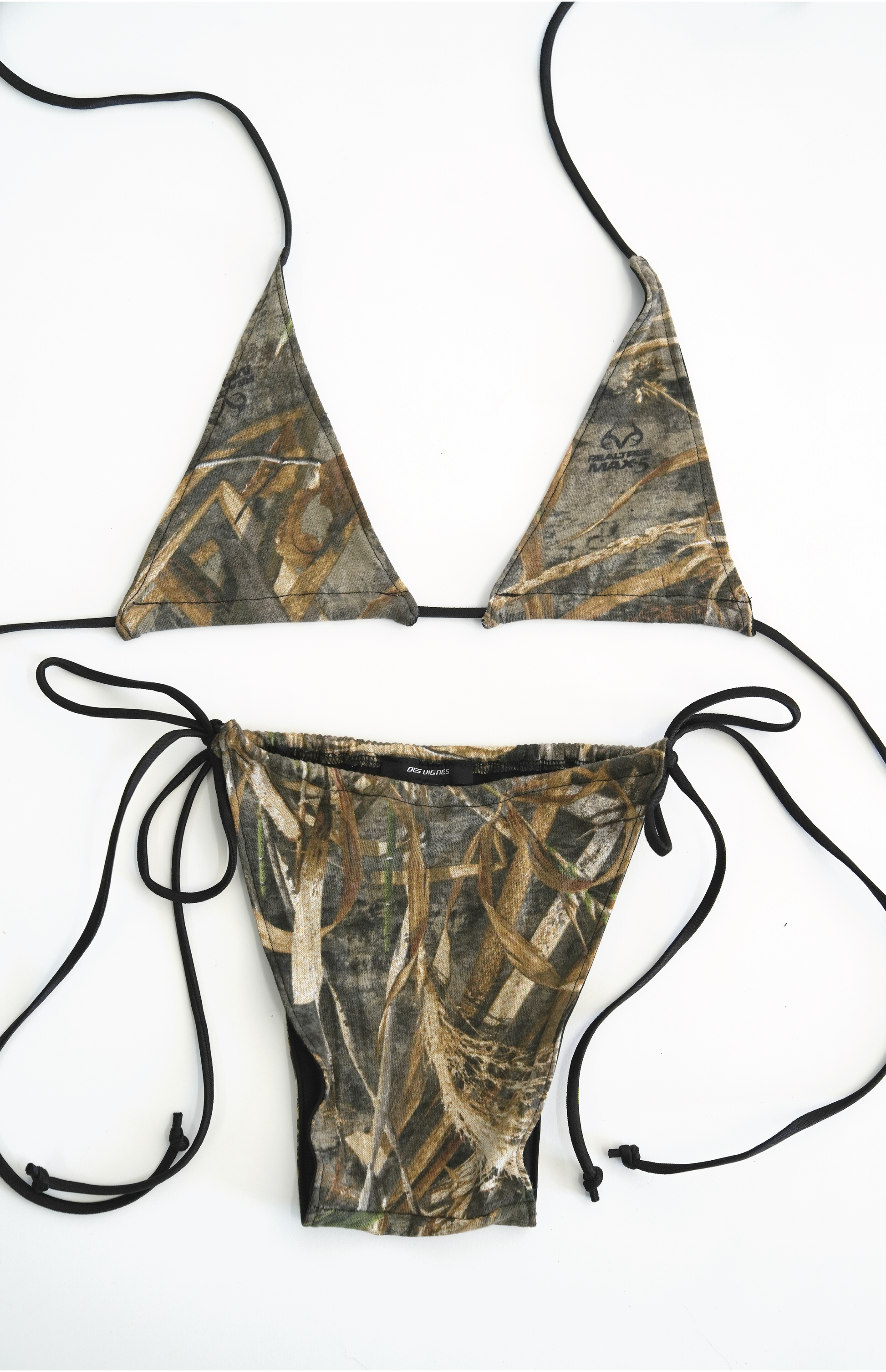 This 1 of 1 kini set is a classic triangle bikini shape with ultra-thin straps that tie around the neck and back to give you a comfortable, custom fit. Kini bottoms are super cheeky with adjustable ties at the sides.
